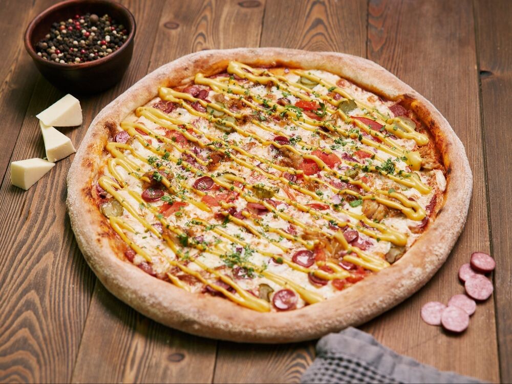 Пицца с нежным тестом и соусом пелати. На ней — кусочки курицы, моцарелла, томаты, солёные огурцы и красный лук. Горчичный соус добавляет пикантности