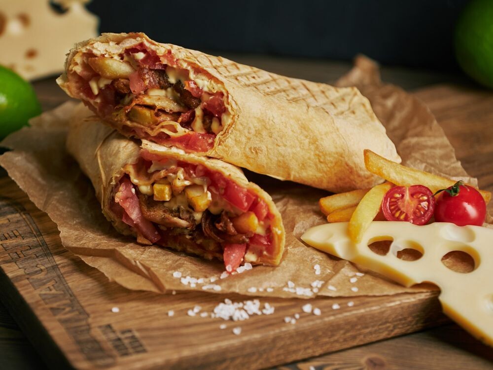 Сочная шаурма с цыплёнком, моцареллой и чеддером. Хрустящий лаваш и картофель фри добавляют текстуру. Спелый томат придаёт свежесть