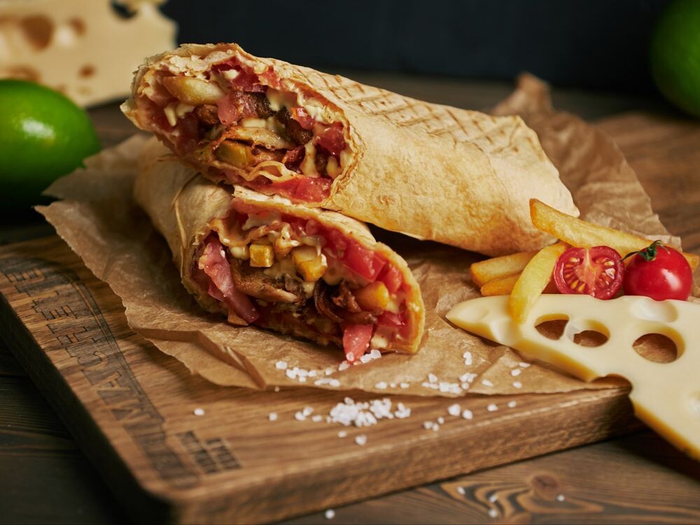 Погрузитесь в мир вкусов с нашей шаурмой, где нежный цыплёнок гармонично сочетается с тягучей моцареллой и чеддером, а картофель фри и спелые томаты добавляют пикантности и сочности